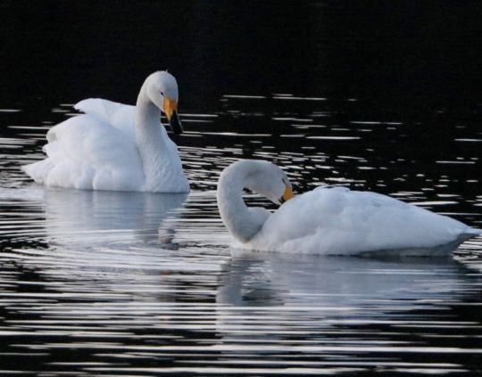 :当地に飛来する白鳥はほとんどがコハクチョウです。ただ冬が終わるころ、山陰などへ渡ったオオハクチョウが北帰行の途中で大潟区の朝日池や鵜の池に寄って休むことがあります。表紙は以前撮った朝日池のオオハクチョウです。こちらはコハクチョウよりも一回り大きくどこか優雅に見えます。