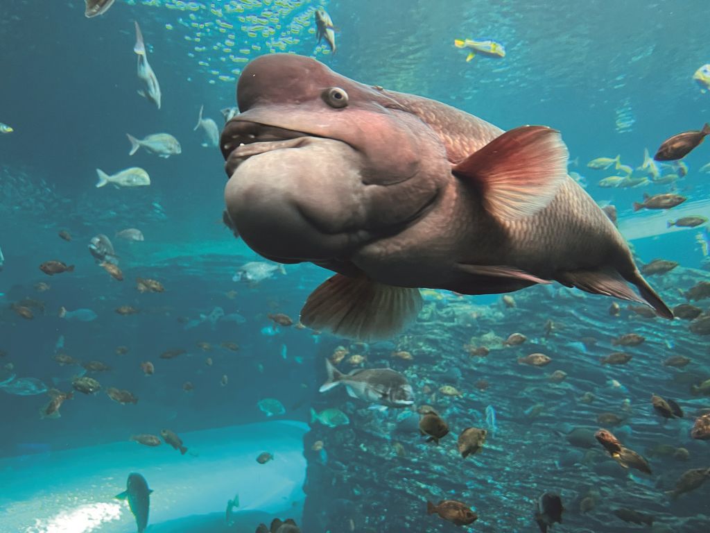 :写真は、うみがたりの大水槽で飼育されているコブダイです。縄張り意識が強く、水槽内には一匹しか入れられません。コブダイは生まれてからある程度成長するまでは全てメスで、その中の一番大きい個体がオスとなり、オスに性転換するとコブが出始めます。