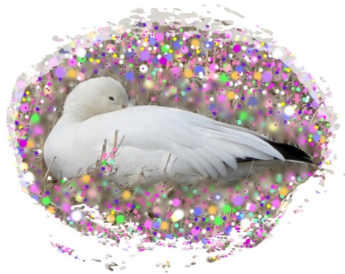 :上越市大潟区の朝日池は日本で数少ないハクガンの飛来地です。昨冬2月末、頸城区の水田で群を撮りましたのを正月向けに少し加工しました。