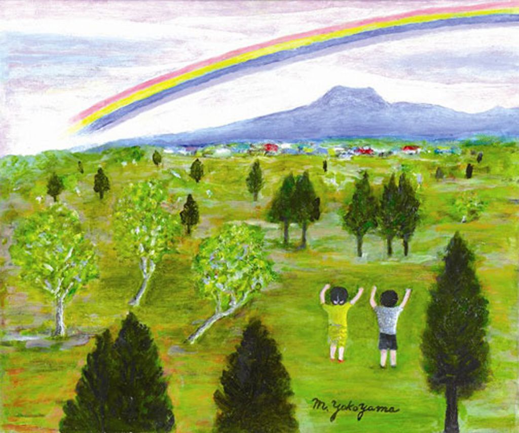 当時、虹と妙高を作詞されたがその大意は「千古天上に風雪にじっと堪えて来た山だから、せめて短い夏の間は虹のショールで包んでやろう」という詩だったように記憶するのだが。で、いつぞや妙高パインバレーにスケッチに行った際遥か彼方に雄大な妙高山と中天に懸かった美しい大きな虹、それも一瞬の風景であるが、目の前にし感動して絵筆を採った次第である。(平成17年11月会報表紙より)