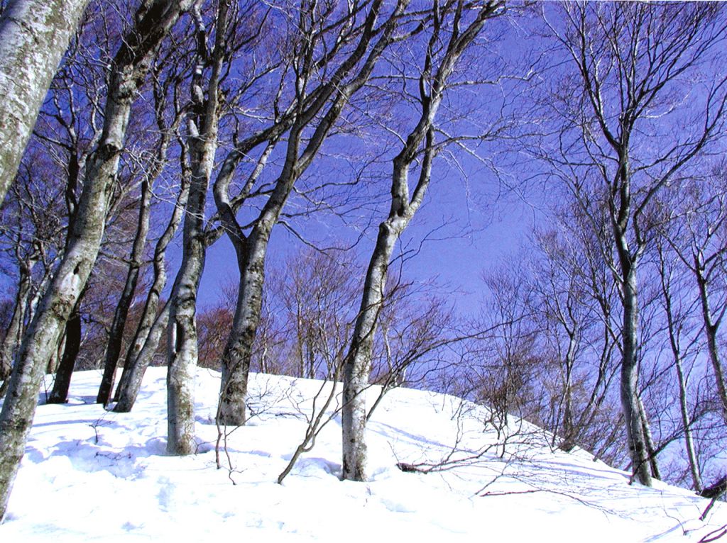 :天候の悪い時の冬山は悲惨ですが、晴れた日の山行は輪カンを履いた長時間の辛いラッセルも何のそのブナ林から青空を眺めるととても勇気が湧いてきま。この写真は‘02.1.14の米山で撮りました。今年も晴れ間をみて雪の米山に何回登れるでしょうか。(平成18年1月会報表紙より)