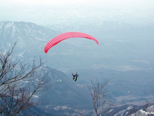 :この写真は平成14年3月米山のてっぺんからパラグライダーで飛びたった直後をサポーターの一人にに頼んで撮ってもらった写真です。見聞や記録をあたってみましたが、米山山頂からパラグライダーでテイクオフしたのはこれが初記録でした。(平成21年3月会報表紙より)