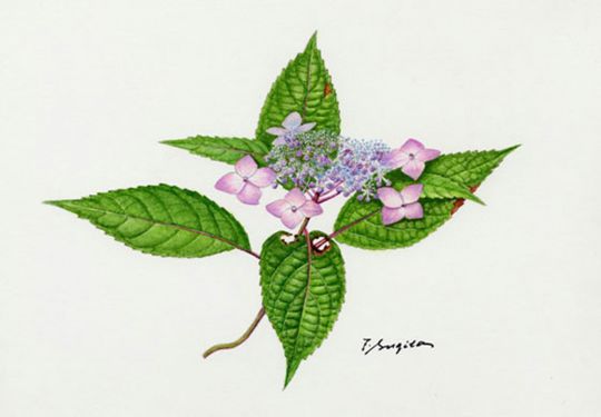 :実際の花は自分が描くより何十倍以上も美しい。ところでがくあじさいのような人が居るならどんな人だろう。可愛いくて、楽しい変化があり、梅雨空のもとでもすっきりと・・・。花はしばしばとりとめない空想を駆り立てる。(平成17年5月号会報表紙より)
