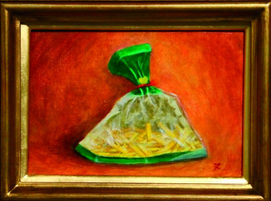 :30年振りに油絵を描いた。目の前のいもけんぴの黄色が気に入って描き始めた。画面はハガキ二枚より一回り大きいSMサイズ。めんどうな水彩よりも楽しく描けたが、如何にも明治時代の油絵といった感じになった。