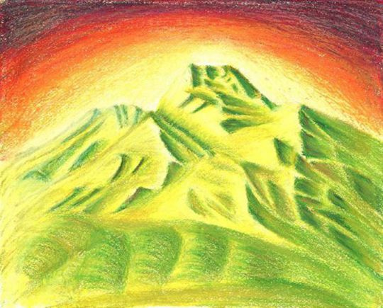 :直江津から見える妙高山は、南葉山の後ろに隠れ頂上を拝むのみですが、近くに寄るとその強烈な存在感に圧倒されます。周囲を幾多の山が取り囲み、その中の「前山」のまわりが崩れ、ちょうど女性の胸もとの様です。絵は長野との県境にある信越大橋から見た妙高山です。(平成17年7月号会報表紙より)