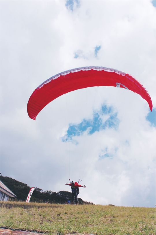 :この写真は柿崎区と吉川区の境にある尾神岳の山頂付近、標高約680mのパラグライダー基地から Skywalk Chili 3というグライダーで私が下界めがけてまさに飛び立つ(Take off)寸前の姿をパラ仲間が写してくれた写真です。新しい処へ「Take off」と言うことで新年号の表紙に選んでみました。(平成27年1月会報表紙より)