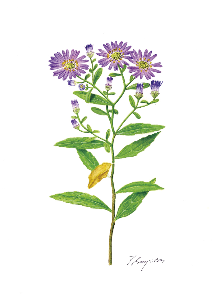 : ノコンギクは路傍の花で薄い色調から濃いものまで色々ある。野菊と言われる一種なので群れて咲くのが見所かと思われるが、一本取り出して描いた。