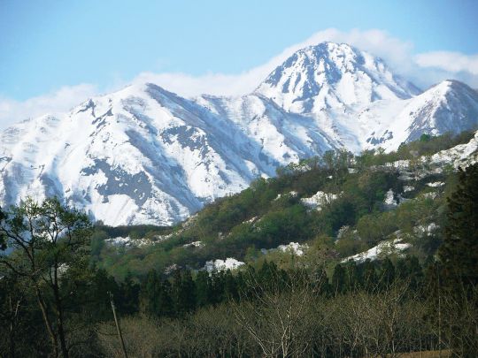 :妙高山の外輪山、神奈山の北東中腹に4月下旬から出現する「跳ね馬」は、「春駒(はるこま)」「跳ね駒(はねこま、はねこんま)」「馬形(まがた)」「牛(うし)」等、地域により呼称も違っていたようだ。これは、妙高市西野谷地内の万内川砂防公園の手前で5月初旬に撮影した。「跳ね馬」はもっと遠景のほうが趣がある。(平成29年5月会報表紙より)