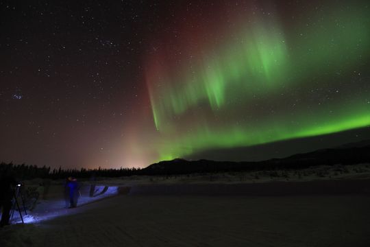 コメント:カナダの極北地方の最西端でアラスカと国境を接するユーコン準州で、針葉樹の森とツンドラの広がる中の州都ホワイトホースは、同じカナダのイエローナイフと並んで高い確率でオーロラが見られることで世界的に有名な場所でもあります。ホテルから車で永久凍土の道を30分ほどの所にある森の中の丸太作りのcottageで薪ストーブで暖を取りながらオーロラが現れるまで待機します。