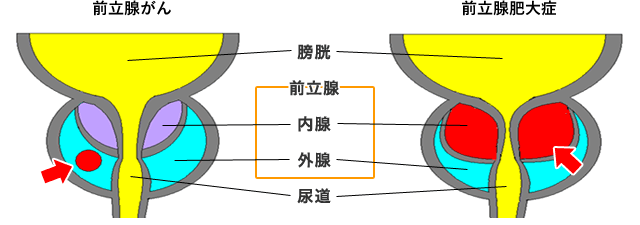 前立腺は男性の膀胱下に、尿道を囲むようにあります。主な病気は、前立腺がんと前立腺肥大症で、発生場所が異なります。