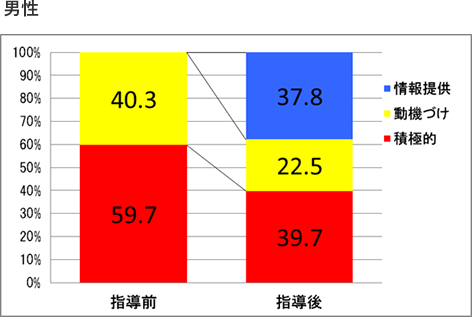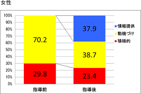 ※特定保健指導では、血圧・糖代謝・脂質で内服治療中の場合は、結果にかかわらず「情報提供」となります。内服治療中の場合は上記データからは除外していますので、指導後に「情報提供」となった男性37.8%、女性37.9%は健診結果が改善したことにより「情報提供」となった方々です。