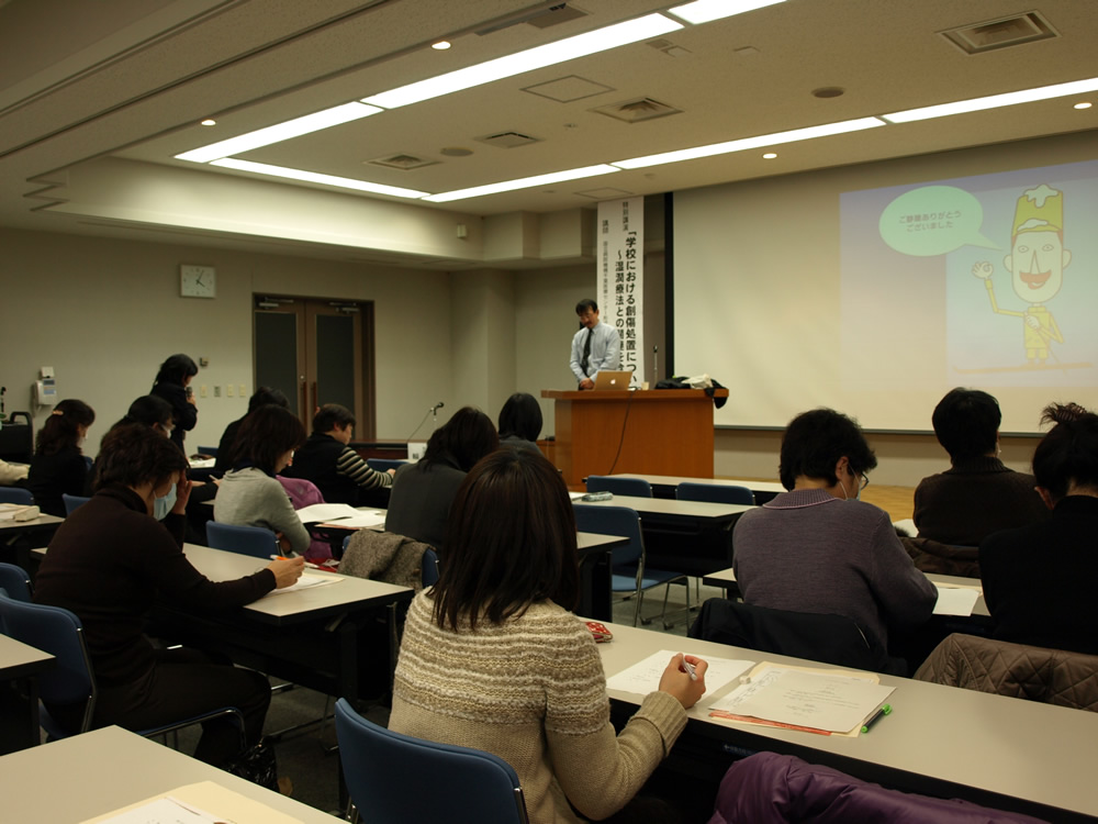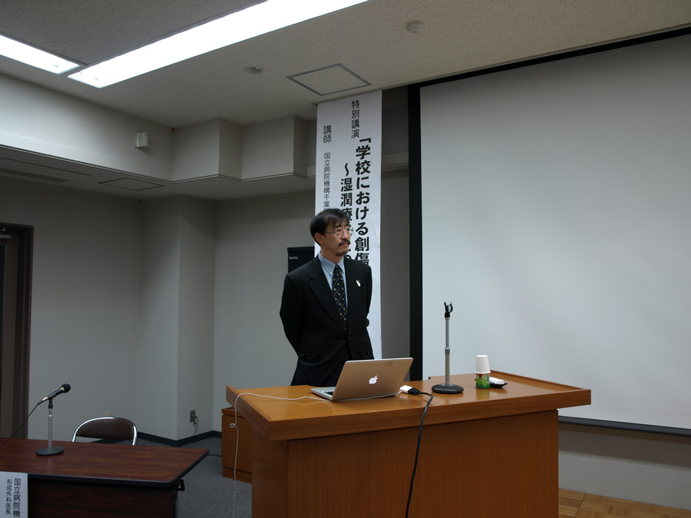 特別講演では、国立病院機構千葉医療センター形成外科医長の輪湖雅彦先生をお招きし、「学校における創傷処置について~湿潤療法との関連を含めて~」と題し、ご講演をいただきました。湿潤療法は自然にかさぶたができるより早く人工的にかさぶたの状態をつくり治癒を促進する方法で、治療には消毒薬を使わず水道水か生理食塩水で土や血液を洗い流した後、軟膏を塗り非固着性吸収パッド等のドレッシング材でカバーし、乾燥させないことが基本と話されました。また、市販のドレッシング材の利点や注意点、外傷の他に咬み傷、やけどについての治療、学校から医療機関へ送る目安等を写真やフローチャートでわかりやすく講演されました。