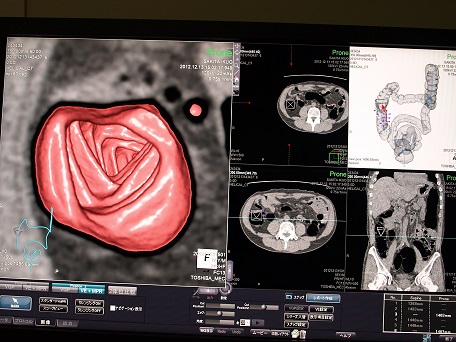 当センターでは、ドック健診等のオプション検査として大腸CT検査を開始致しました。大腸CT検査とは、大腸に炭酸ガスを注入し拡張させ、マルチスライスCT装置で撮影、その後、コンピューターで画像解析をおこなう事により、大腸内視鏡検査や注腸検査に似た大腸の3次元画像を得て診断を行う検査です。検査での痛みはほとんどなく、検査も10分ほどで終了します。50歳以上で今まで大腸内視鏡検査等を行っていない方におすすめします。