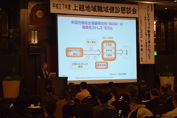 開会挨拶、来賓祝辞の後、今年12月より開始される「ストレスチェック制度」について研修が進められ、初めに、上越労働基準監督署 久川禎之安全衛生課長様より「職場におけるメンタルヘルス対策」と題して、また、上越地域振興局福祉環境部 地域保健課 精神保健相談員 田村敦子様からは、「上越地域のメンタルヘルス不調者への相談支援体制について」と題して、それぞれ行政の立場から情報提供があり、その後、特別講演では公益財団法人健康・体力づくり事業財団理事長、東京医科大学名誉教授の下光輝一先生から「ストレスチェック制度の導入について~指針・マニュアルに基づいた実施のポイント~」と題して、導入した経緯や問題点等も含めて詳しくお話をしていただきました。