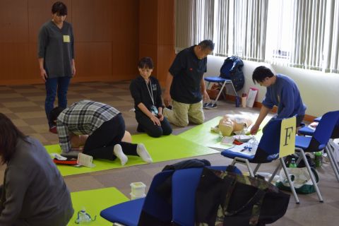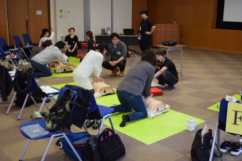 当日は、医師・医療従事者等11名が受講し、AHAガイドライン2015に準拠した内容で実施されました。胸骨圧迫や人工呼吸など救急隊に引き継ぐまでの処置を中心に繰り返し練習し、AEDの使用方法についても学びました。 |
