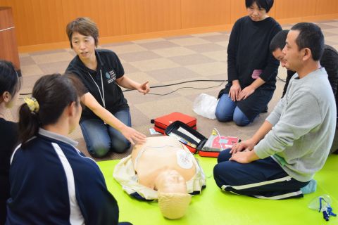 当日は、医療従事者等9名が受講し、AHAガイドライン2015に準拠した内容で実施されました。胸骨圧迫や人工呼吸など救急隊に引き継ぐまでの処置を中心に繰り返し練習し、AEDの使用方法についても学びました。 |
