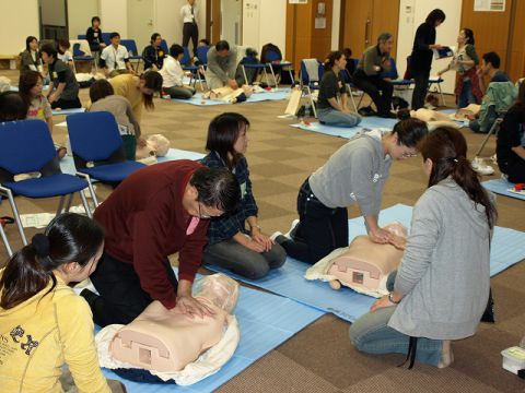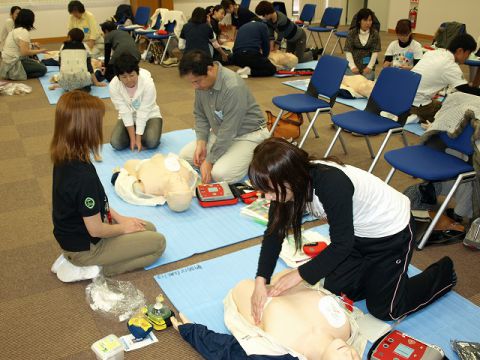講習内容はAHA2005年版ガイドラインに基づいた内容で、人工呼吸や心臓マッサージ等の心肺蘇生術、自動体外式除細動器(AED)の使用法、窒息の応急手当について、DVDで放映されるインストラクターの手技を視聴しながら、実技を中心に行われました。