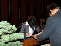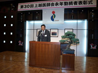 上越医師会長より「現在の医療体制は医療崩壊に至る危機的状態にあるが、私達は少しでも改善の努力をしなければならない。開業医の使命であるかかりつけ医機能が十分に発揮できるようこれからも皆さんの協力をお願いしたい」旨の挨拶の後、出席者一人ひとりに表彰状と記念品が手渡されました。最後に被表彰者の代表より「本日の栄誉を胸に、奢ることなく今までやってきたことをこれからも続けるとともに心新たな気持ちで邁進する所存ですので、これからもご指導賜りますようよろしくお願い申し上げます。」と謝辞がありました。引き続き、記念撮影と懇親会に移りました。