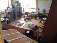 (左)側溝が陥没した患者様用駐車場 (右)書棚の転倒した書斎 |