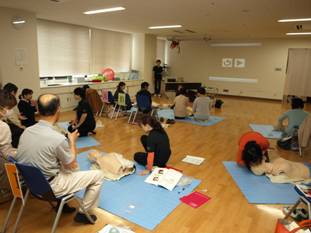 当日は、医師、医療従事者等22名が受講し、実際に目の前で人が倒れた場合、胸骨圧迫や人工呼吸法の実践、AEDの使用方法等を学び、救急隊に引き継ぐまでの処置を学習しました。