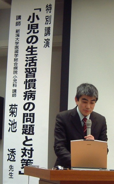 今回の特別講演の講師には、新潟大学医歯学総合病院小児科講師の菊池透先生をお招きし「小児の生活習慣病の問題と対策」と題して、ご講演をいただきました。小児肥満の問題点、小児生活習慣病の現状、指導についての話があり、特に小児生活習慣病対策の基本は「学校での健康教育」である。その理由として、日常的に子供及び保護者との接触ができる利点があり、保健教育は学校で行うべき本質的な課題である。子供の頃に適正な食習慣、運動習慣、禁煙習慣を身につけた人は、適正な体格、健全なこころとからだを維持でき、本人および子孫の健康を維持することができる等のお話がありました。